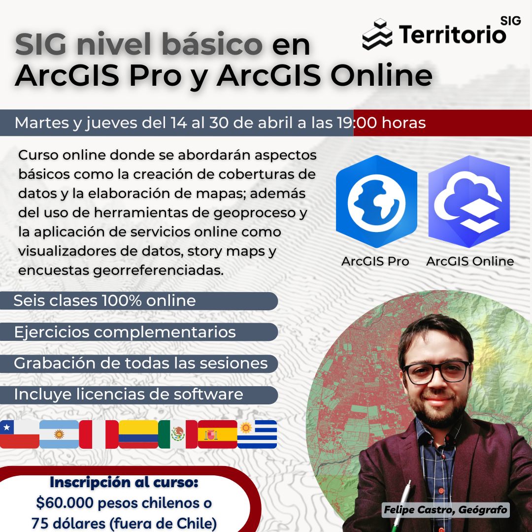 Curso online enfocado al uso de herramientas de Sistemas de Información Geográfica (SIG) mediante los softwares ArcGIS Pro y ArcGIS online, a realizarse los días martes y jueves del 14 al 30 de abril de 2026, de 19:00 a 21:00 horas de Chile vía Google Meet. Cada sesión se graba y posteriormente se entrega a quienes participen para su visualización y descarga. Nuestas instancias de aprendizaje SIG en ArcGIS incluyen licencia educativa para ArcGIS Pro, ArcGIS online y ArcGIS Desktop mientras se realice el curso. *Software ArcGIS es compatible solo con sistema operativo Windows, para MAC es necesario un emulador. Se recomienda una memoria RAM de 8 GB o superior. * Incluye licencia educativa para ArcGIS Desktop y ArcGIS Pro, además de acceso a ArcGIS Online.